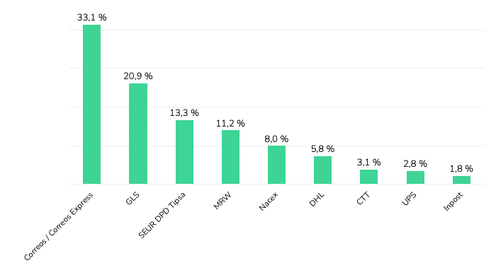 Across Spanish webshops where delivery provider brands are visible, Correos / Correos Express holds the first position most frequently (33,1%), followed by GLS (20,9%) and SEUR / DPD / Tipsa (13,3%). MRW (11,2%) and NACEX (8,0%) follow, with DHL (5,8%) and smaller shares for others.