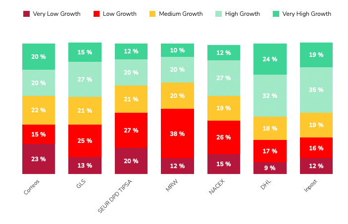 Finally, our Growth Indicator model adds a forward-looking layer: DHL and InPost have the strongest growth-weighted portfolios, with 56% and 54% of their clients forecast to be in high or very high growth bands. Correos shows a more balanced mix across growth bands.